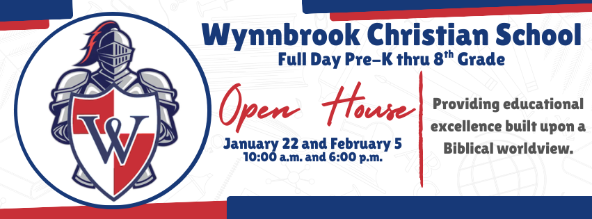 On January 22nd and February 5th, 2026, Wynnbrook Christian School welcomes prospective students and families to our hillside campus for our 2026/27 Admissions Open House. Discover firsthand the Christ-centered academics, competitive athletics, and servant leadership opportunities Wynnbrook has to offer.