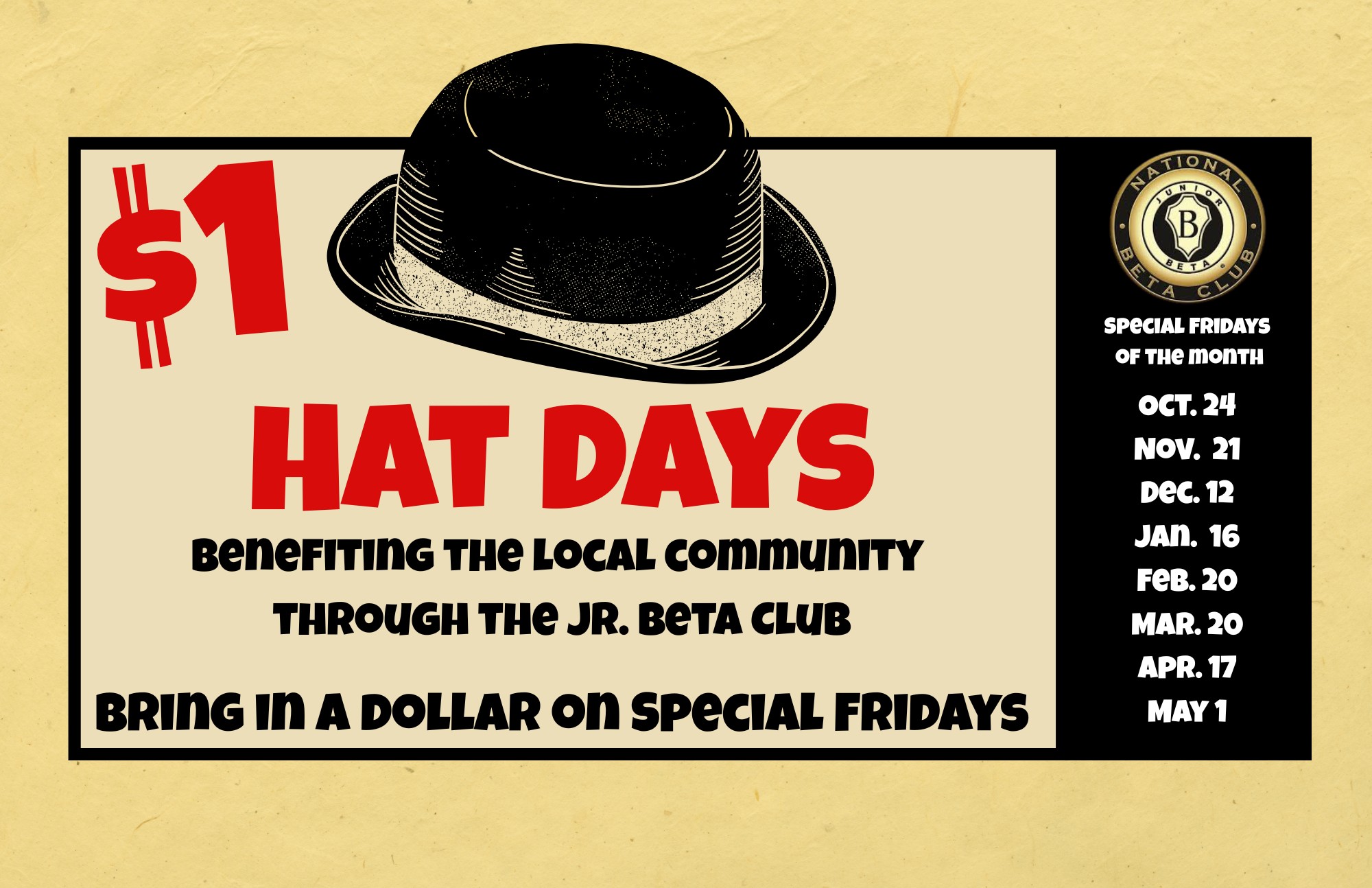 On special Fridays of the Month, support the Jr. Beta Club by bringing in a dollar. Students who bring in a dollar can wear a hat at school!